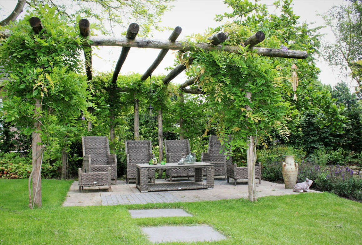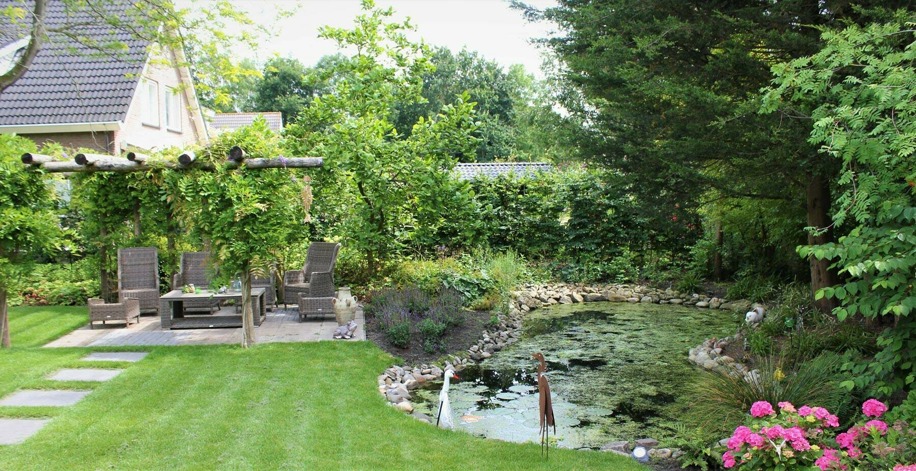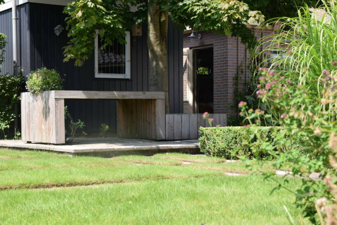 En dan is er nog een grote vijver die veel dierenleven trekt. Het hoogteverschil tussen het gazon en terras is opgevangen door een duurzame cortenstalen rand. De tegels uit de oude tuin zijn hergebruikt voor het terras en gecombineerd met strakke klinkers uit een andere tuin wat een speels effect geeft. De robuuste pergola bij het loungeterras is gemaakt van onbehandeld kastanjehout. De blauweregen zorgt hier - op den duur – voor verkoelende schaduw in de zomer.