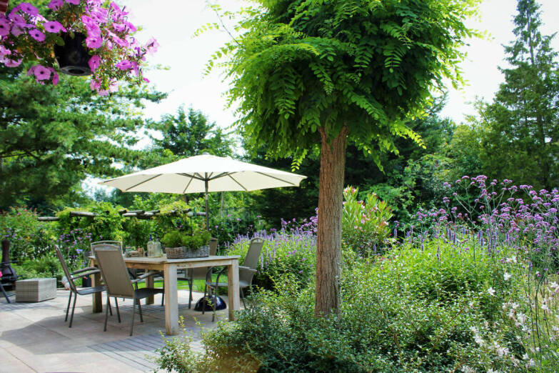 Een grote variatie aan planten is niet per se nodig in een duurzaam tuinontwerp. “Less is more. Soms kun je met heel weinig al een heel mooi effect bereiken”, legt Gienus uit. “Het kan zomaar zijn dat er in één ruimte alleen maar behoefte is aan een mooie, grote boom en verder niks. Dan is de boom de drager van de tuin als blikvanger. Je moet als tuinontwerper ook goed in verhoudingen kunnen denken. De verhouding tussen ruimte en massa moet goed zijn.”
