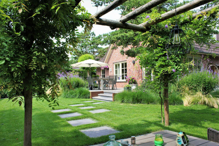 Deze sfeervolle tuin in Almere oogt heel groen dankzij het grote gazon, de weelderige borders en de verschillende bomen. “Zeker twee derde is groen, dan heb je een tuin met een goede verhouding tussen harde materialen en beplanting. Er staat hier een boom dicht bij het terras, dat is altijd mooi want dat geeft een goede dieptewerking. De groene omgeving werkt ook mooi in het beeld van de tuin. Behalve een groene uitstraling draagt deze tuin bij aan de biodiversiteit. Er zijn veel planten voor bijen en hommels, en vogeltjes komen hier vanzelf wel.”