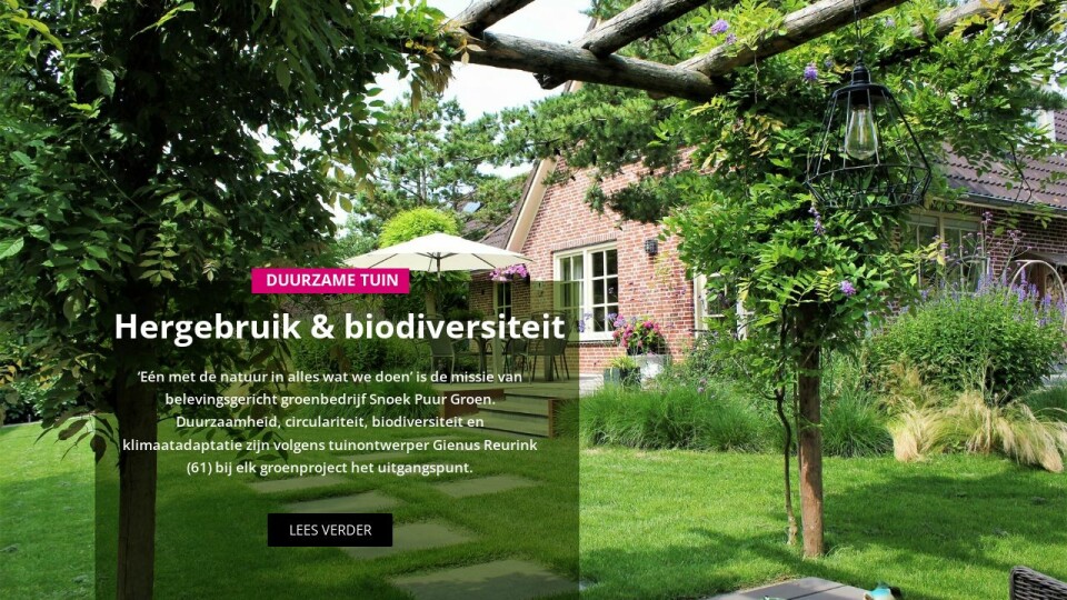 ‘Eén met de natuur in alles wat we doen’ is de slogan van hoveniersbedrijf Snoek Puur Groen. Duurzame materialen, hergebruik en biodiversiteit zijn volgens tuinontwerper Gienus Reurink (59) bij elk project het uitgangspunt, en als het even kan ook de opvang van regenwater.