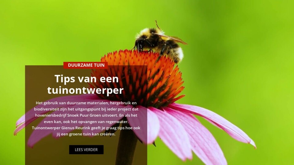 Het gebruik van duurzame materialen, hergebruik en biodiversiteit zijn het uitgangspunt bij ieder project dat hoveniersbedrijf Snoek Puur Groen uitvoert. En als het even kan, ook het opvangen van regenwater. Tuinontwerper Gienus Reurink geeft je graag tips hoe ook jij een groene tuin kan creëren.