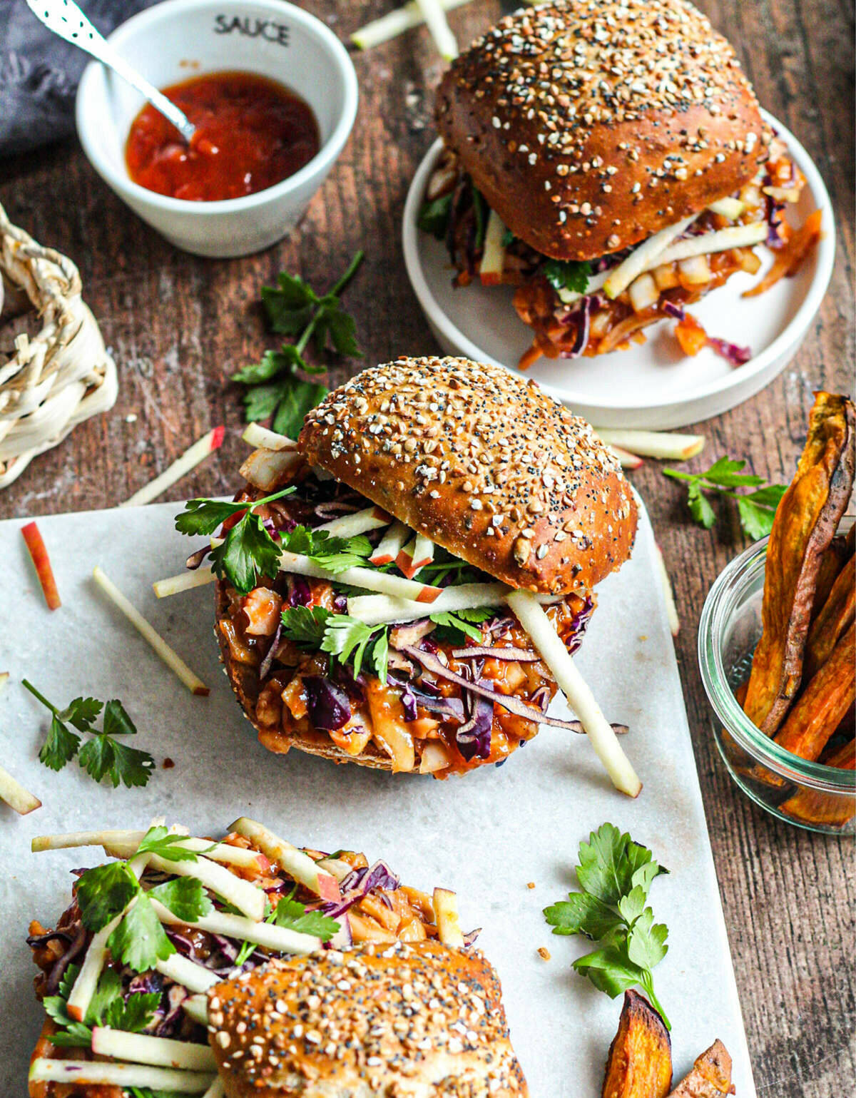 3 Snijd de broodjes open en beleg ze met de bbq-jackfruit mix. Verdeel wat reepjes appel, rode kool en eventueel verse koriander eroverheen.