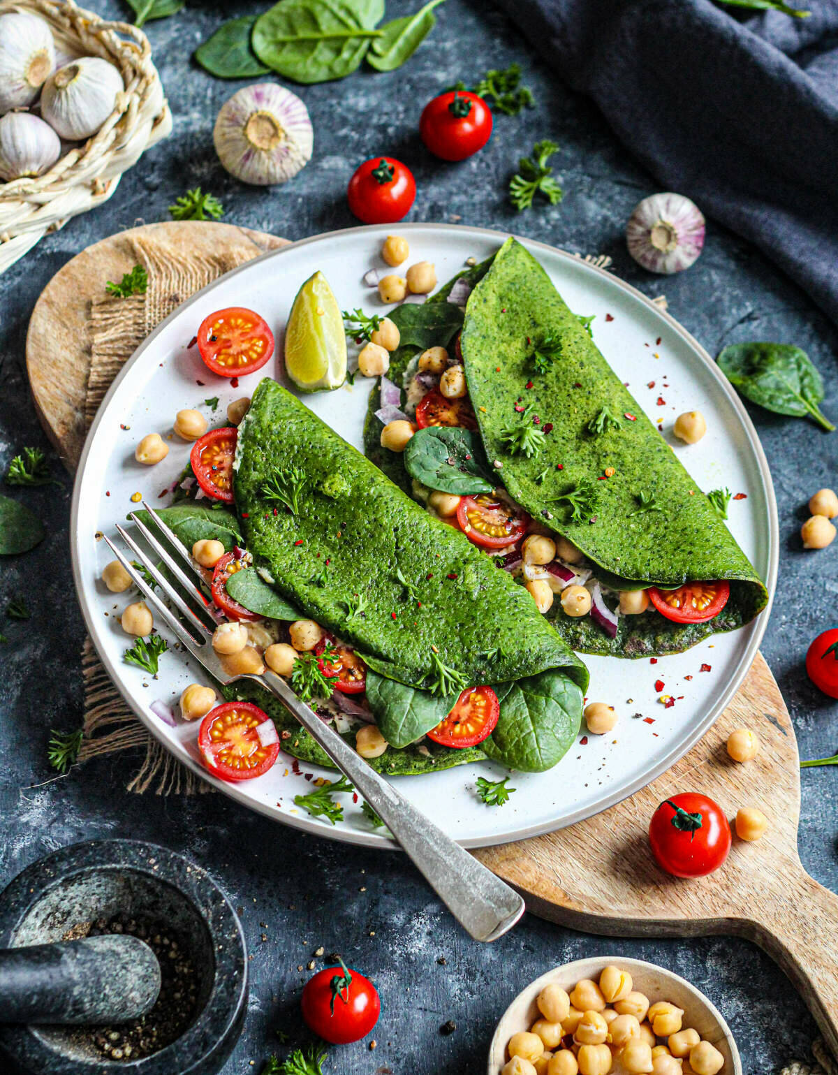 6 Serveer de pannenkoeken vers uit de pan of houd ze warm in de oven op lage temperatuur, afgedekt met een theedoek. Beleg de pannenkoeken met hummus, cherrytomaatjes, kikkererwten, rode ui, verse peterselie en wat peper, zout en knoflookpoeder, of kies je eigen favoriete toppings.