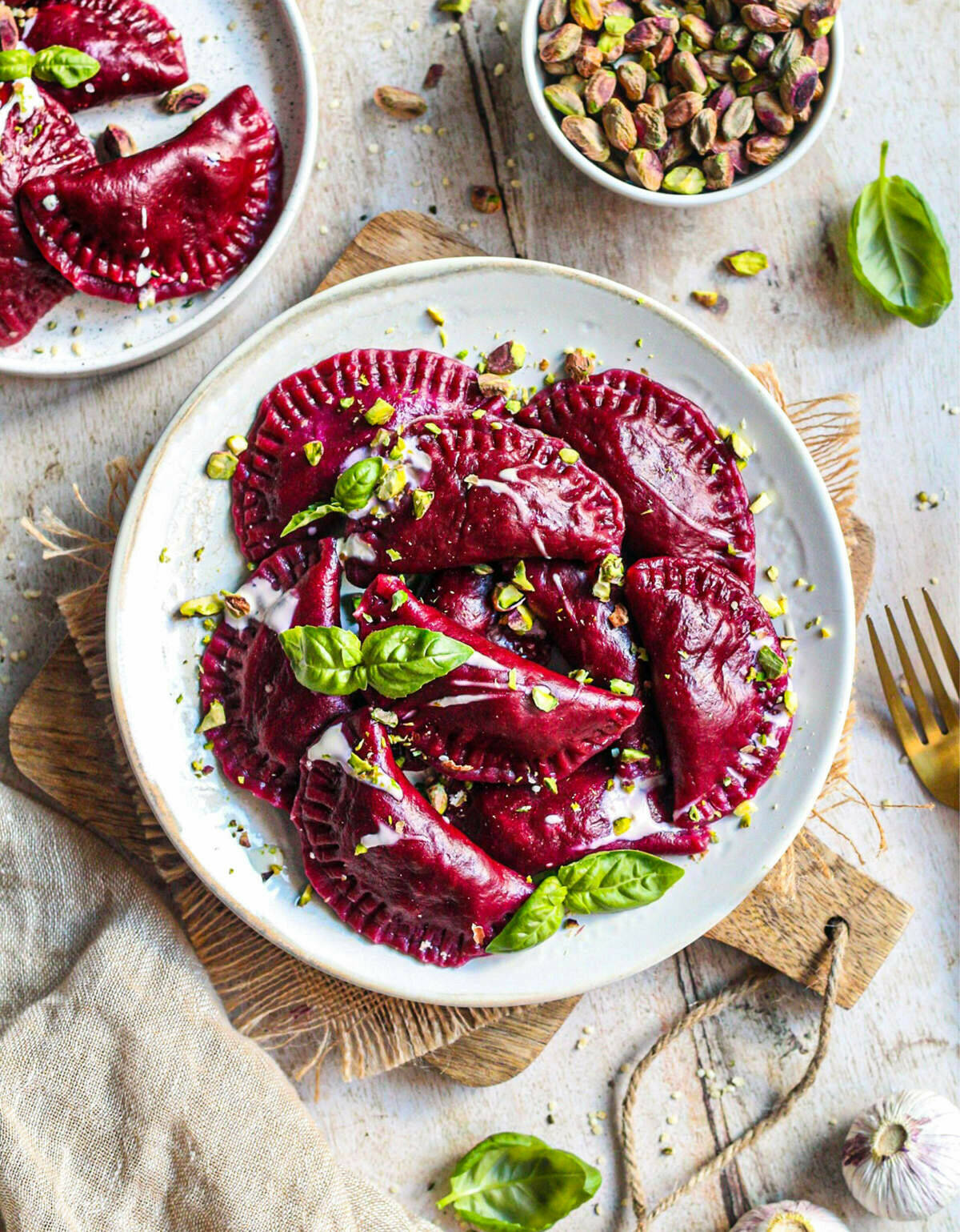 1 Mix de tarwebloem, het zout en bietensap in een grote kom. Roer alles door elkaar met een lepel en kneed minimaal 10 minuten met je handen tot een stevig deeg. Maak een grote bal van het deeg en wikkel hem in plasticfolie. Laat 30 minuten rusten in de koelkast.