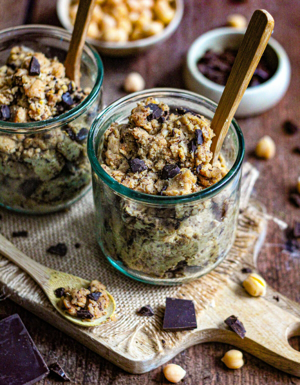 1 Laat de kikkererwten goed uitlekken en spoel ze vervolgens goed af. Doe de kikkererwten in een keukenmachine en voeg de amandelpasta, havermout, agavesiroop, het vanille-extract en zout toe. Mix tot een dik en romig mengsel. Voeg eventueel een scheutje plantaardige melk of meer notenpasta toe als het mengsel te dik is. Roer de gehakte chocolade door het kikkererwtenmengsel.
