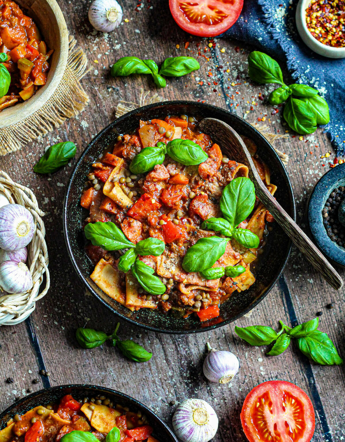 5 Serveer de lasagnesoep in een kom en garneer met pijnboompitten en/of vers basilicum.